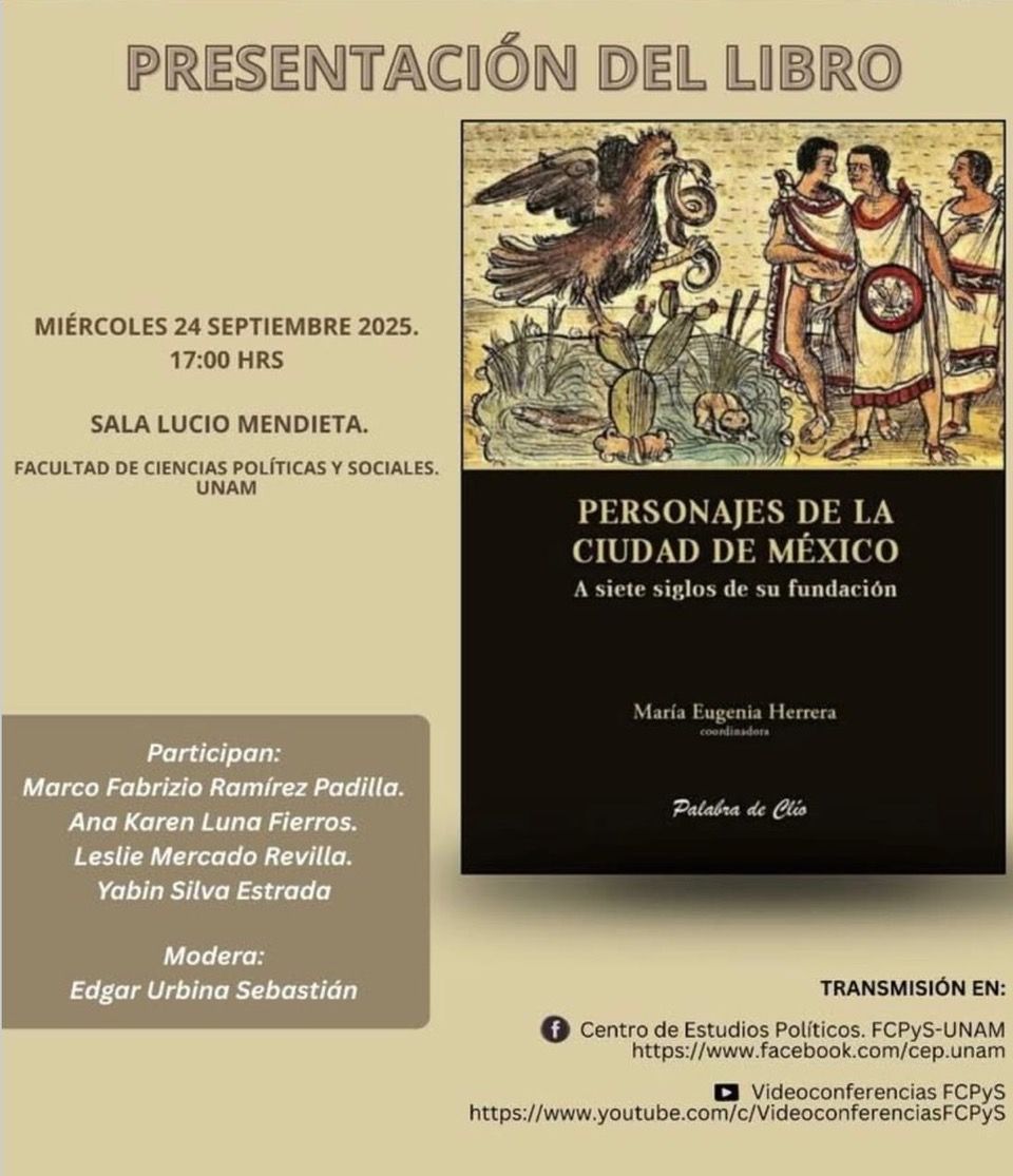 Presentación del libro: Personajes de la Ciudad de México a siete siglos de su fundación. María Eugenia Herrera. ZOOM Clío. Abril 28’25.